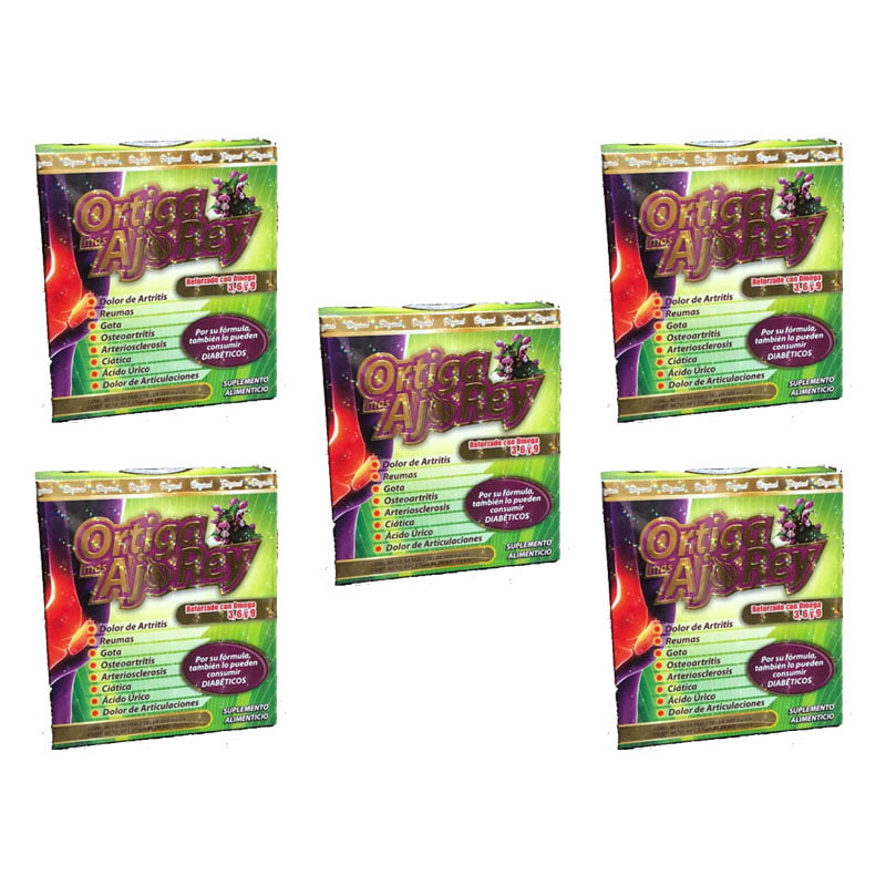Descubre los beneficios de la Ortiga Mas Ajo Rey, Original, un suplemento herbolario 100% natural disponible en una presentación especial de 5 paquetes. Este producto combina las propiedades de la ortiga y el ajo, dos ingredientes conocidos por sus múltiples beneficios para la salud.