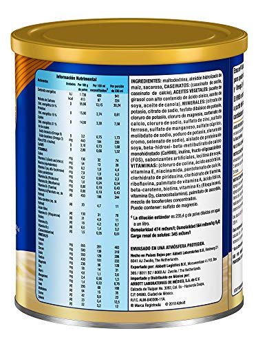 | Ingredientes | maltodextrina, almidón hidrolizado de maíz, sacarosa, CASEINATOS: (caseinato de sodio, caseinato de calcio), ACEITES VEGETALES: (aceite de girasol con alto contenido de ácido oleico, aceite de soya, aceite de canola), MINERALES: (citrato de potasio, citrato de sodio, fosfato dibásico de potasio, cloruro de potasio, cloruro de magnesio, carbonato de calcio, cloruro de sodio, sulfato de zinc, sulfato ferroso, sulfato de manganeso, sulfato cúprico, molibdato de sodio, yoduro de potasio, cloruro de cromo, selenato de sodio), aislado de proteína de soya, beta-hidroxi-beta-metilbutirato de calcio monohidratado (CaHMB), inulina, fructo-oligosacáridos (FOS), saborizantes artificiales, lecitina de soya, VITAMINAS: (cloruro de colina, ácido ascórbico, vitamina E, niacinamida, pantotenato de calcio, clorhidrato de piridoxina, clorhidrato de tiamina, riboflavina, palmitato de vitamina A, ácido fólico, beta-caroteno, biotina, filoquinona, vitamina D3, cianocobalamina), palmitato de ascorbilo, mezcla de tocoferoles concentrados.Puede contener: sulfato de magnesio. |