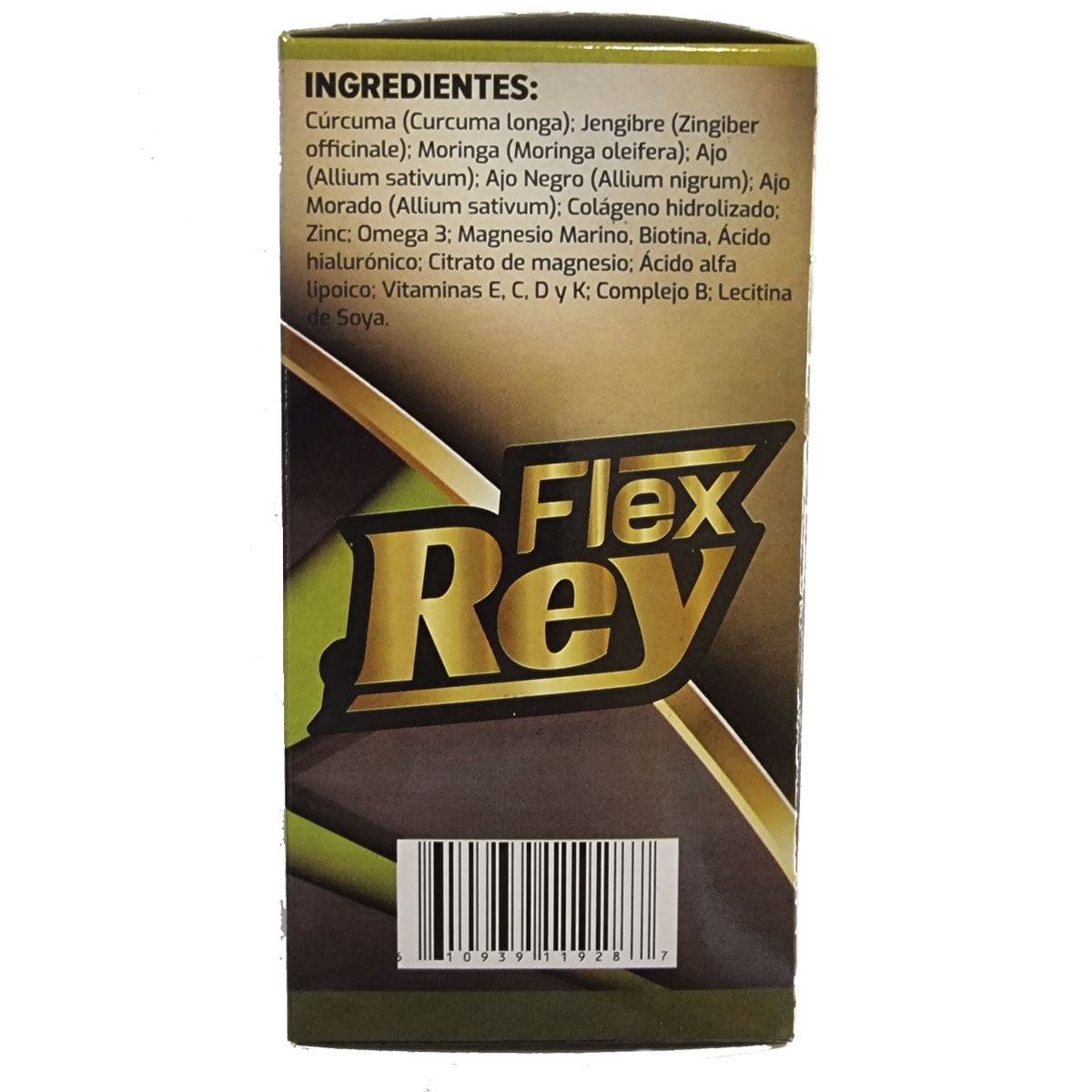 Flex Rey suplemento natural para aliviar el dolor de huesos, con ingredientes 100% naturales, donde, sus principales ingredientes son la cúrcuma, jengibre, omega 3 y moringa.