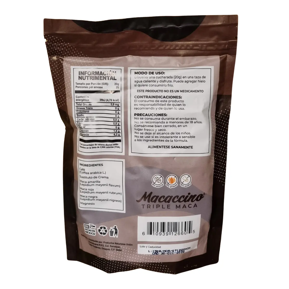 Disfruta del delicioso Macaccino Triple Maca, una mezcla única de café con maca amarilla, roja y negra. Ideal para energizar tu día y mantener tu vitalidad. Sin azúcar, sin grasas y sin sodio, es la opción perfecta para una bebida saludable. Bolsa de 400g.