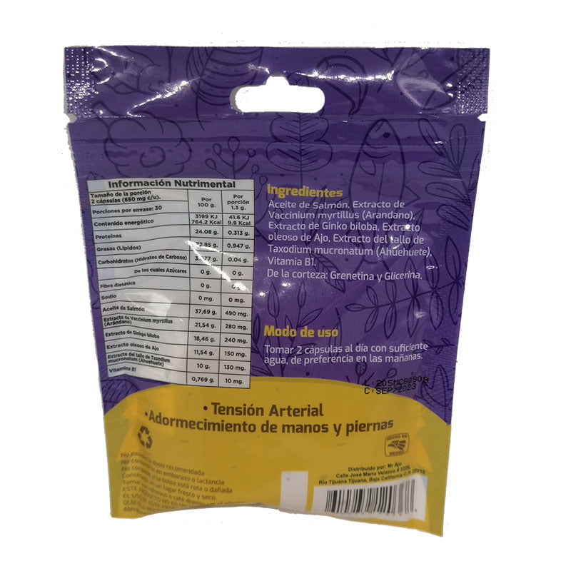 Suplemento alimenticio natural Mr Ajo Omega Circulación de Salmon Salvaje de Alaska, bolsa con 60 cápsulas de gel, reforzado con vitaminas y minerales.