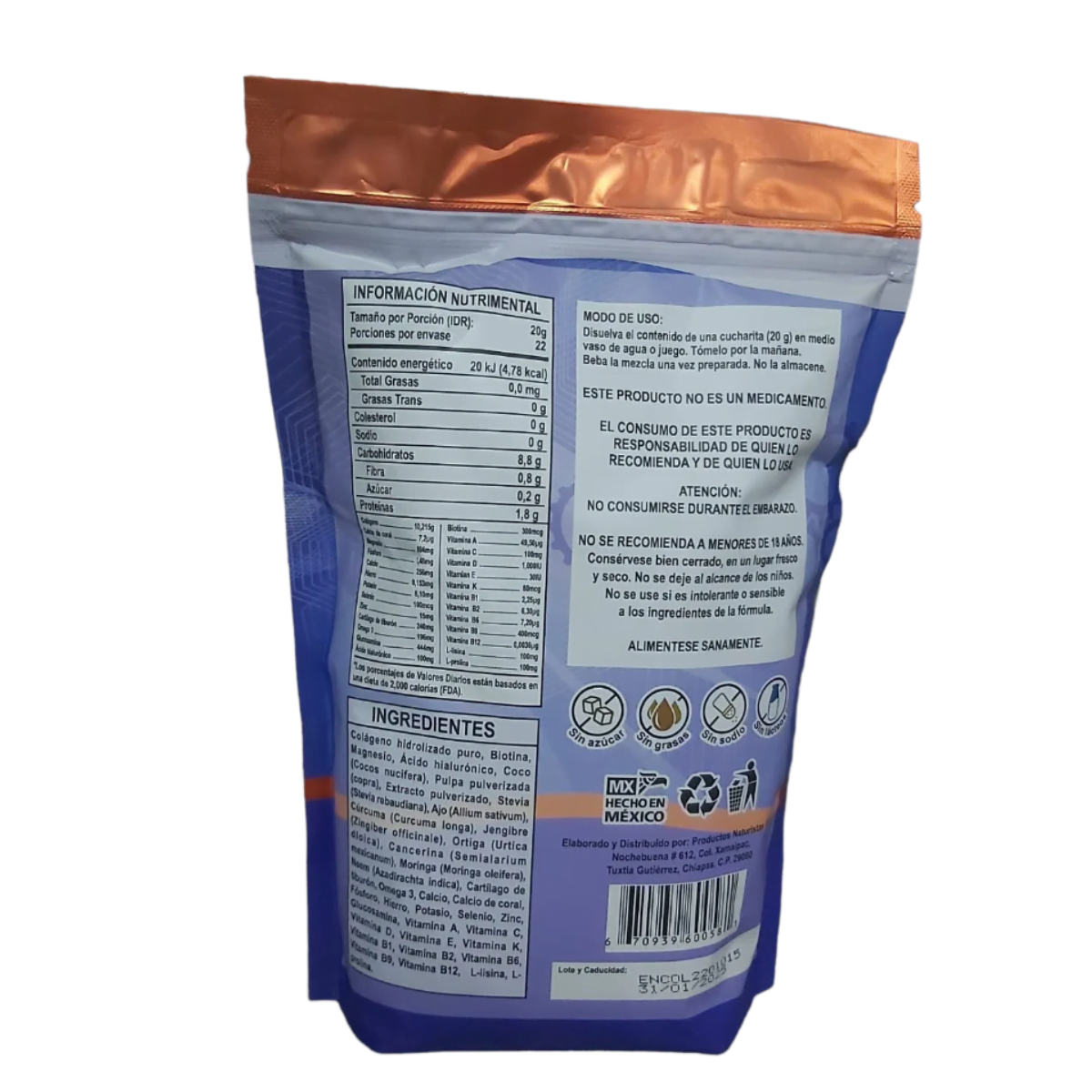 - Nutrición Muscular: El colágeno hidrolizado y el magnesio ayudan a mantener y reparar los tejidos musculares, favoreciendo un cuerpo más fuerte y resistente.
